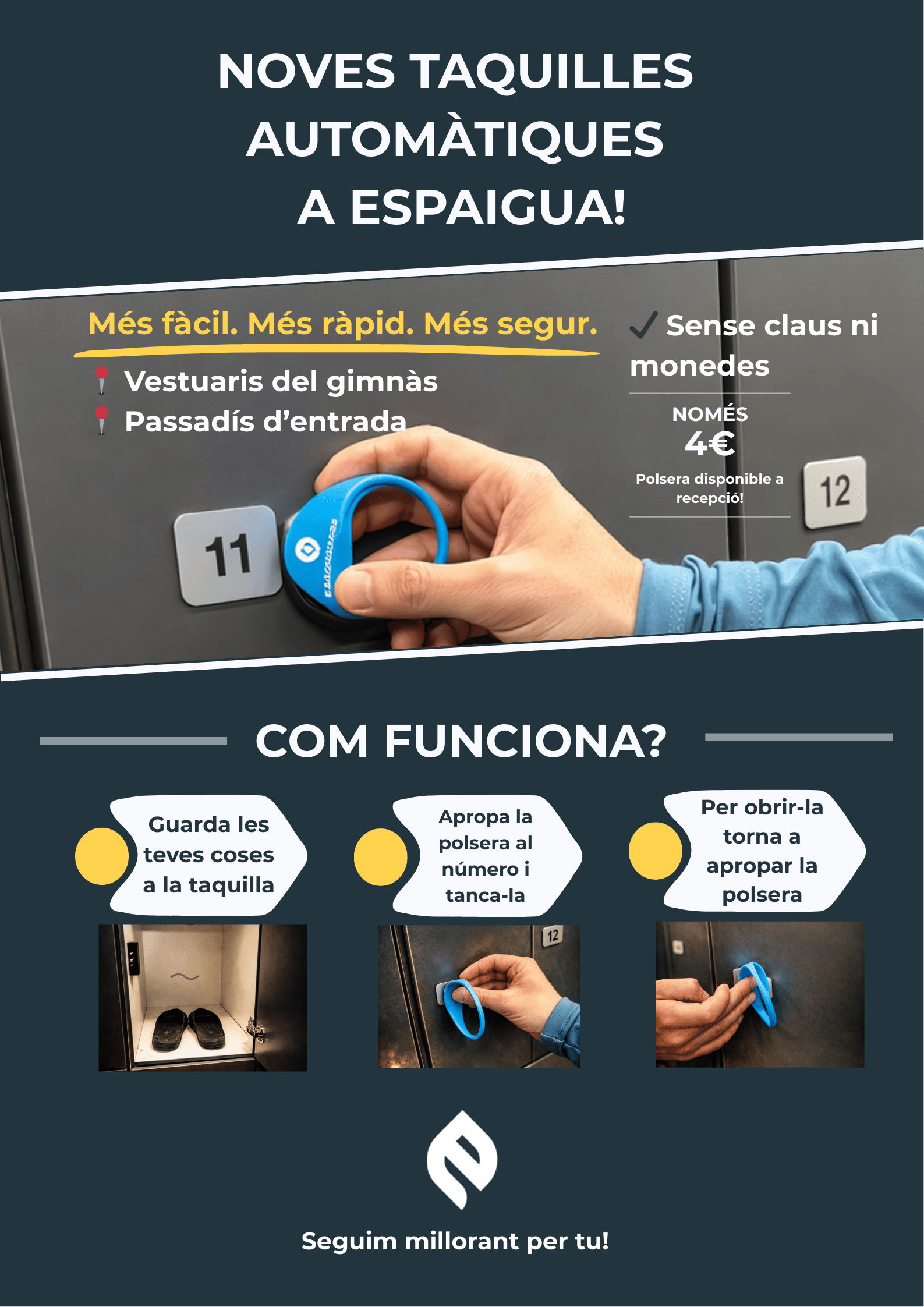 A Espaigua continuem treballant per fer-te la vida més fàcil i còmoda al centre. Per això, ara ja tens disponibles les noves taquilles automàtiques, que funcionen amb la mateixa polsera d’accés al centre.